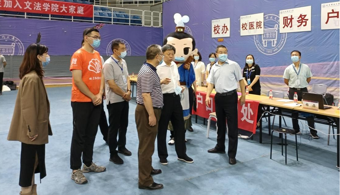 上午九时许,校党委书记武贵龙,校长、党委副书记杨仁树,党委副书记于成文,副校长王鲁宁来到体育馆参观迎新现场,向新生辅导员和相关工作人员询问迎新工作进度和现场情况,并同新生亲切交流,嘱托他们认真做好报到工作,尽快适应大学的生活。学院党委书记魏增产,党委副书记、副院长王旭陪同参观。