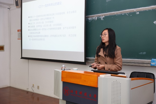 副院长王霁霞首先从一流本科专业建设、本科生导师制完善以及其他重要教学日常工作三个方面介绍了本科教学工作,其次围绕学科学位点申报、学科建设支持计划介绍了学科建设工作;最后介绍了实验室的建设与管理工作,例如虚拟仿真实验室建设及开设虚拟仿真实验教学课程及实训类课程的建设等。