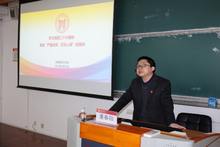 在教职工理论学习环节,党委教师工作部部长董春阳同志为全体教职工做了关于师德师风建设的专题讲座。董春阳以“学习党的二十大精神 发扬严谨治学、甘为人梯”为主题,从中央重要精神、新时代高校教师职业行为准则、学校师德师风建设体制机制建设等几个方面为教职工做了详细解读。一是结合学习二十大的心得体会阐明中央重要精神,强调要办好人民满意的教育,加强师德师风建设,传道者先明道信道,教育者先受教育,并以习近平总书记给我校老教授的回信精神为例,鼓励教职员工继续发扬"严谨治学,甘为人梯"的精神;二是带领大家学习了《新时代高校教师职业行为十项准则》,并结合生动详实的教师师德失范行为案例进行分析,再次强调高校教师要以身作则,加强师德师风建设;三是介绍了学校师德师风建设体制机制,指出要建立健全学校党委、院(系)党组织、教师党支部三级联动的教师工作机制,强化基层党组织在教师思想政治和师德师风建设工作中的作用,强调一方面要选树宣传先进典型,另一方面对因违反师德行为的教师要根据情节依法依规给予相应的处分。