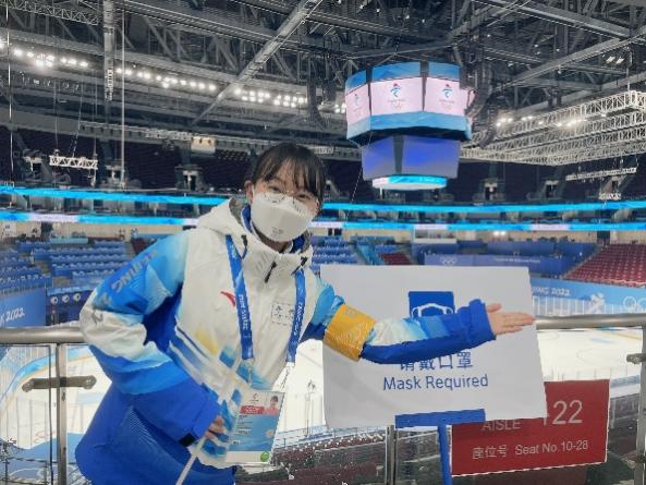 在赛事服务领域我不仅能够服务观众,还能直击纯洁的赛场上燃烧的激情的比赛。志愿过程中,我偶遇了一位08年的志愿者。她这次是作为观众前来观赛的,但是眉目间的温柔热情却让我一下就透过时空感受到属于当年的志愿者拥有的风度魅力:就算戴着口罩,我们也会让观众看到我们“爱笑的眼睛”。未来,我也一定会将这份笑容和热情在生活里延续下去。