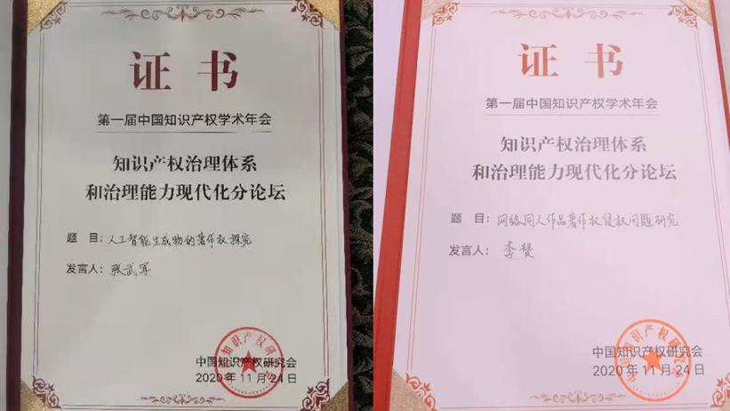 此届年会由中国知识产权研究会主办。参会代表围绕年会主题,以及“民法典下的知识产权与专利法第四次修改”“知识产权治理体系和治理能力现代化”“新技术新业态知识产权保护”“知识产权与经济高质量融合发展”四个议题进行了深入探讨。来自政府有关部门、科研院所、知识产权服务机构等500余名代表,通过线上线下结合的方式参加本次学术年会。国产视频 张武军教授指导的研究生王新颖和李赞分别做了“人工智能生成内容的著作权保护研究“和”网络同人小说著作权侵权问题研究“大会发言。