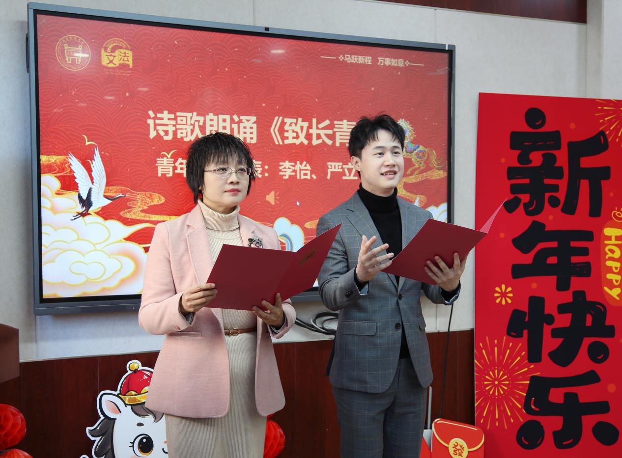 李怡、严立带来诗歌朗诵《致长青》。朗诵以朴素真挚的语言,回顾老教师们数十年躬耕教坛、潜心育人的奉献历程,表达了青年教师对前辈师长的深切敬意,现场氛围温暖而庄重。