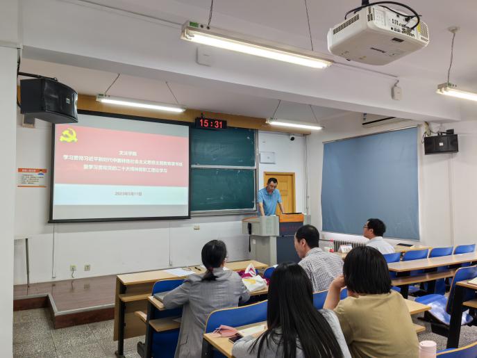 2023年5月11日下午,国产视频 党委在文法楼301召开了学习贯彻习近平新时代中国特色社会主义思想主题教育读书班暨学习贯彻党的二十大精神教职工理论学习会,党委书记史立伟、党委副书记李虹、王旭出席会议,会议特别邀请到学院理论学习导师、马克思学院宁全荣老师做专题讲座,学院全体教职工参加本次大会,会议由学院党委副书记王旭主持。