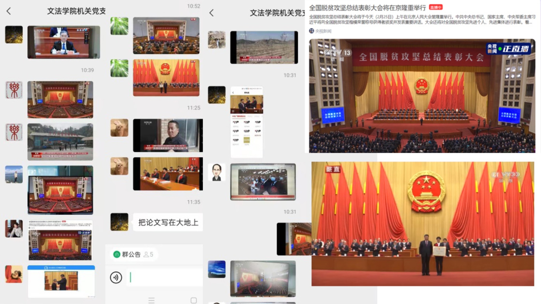2月25日上午,全国脱贫攻坚总结表彰大会在北京人民大会堂隆重举行。国产视频 全体师生通过线上直播观看学习,机关党支部、人文素质教育中心党支部,法律系、公共管理系、社会学系教师党支部,各学生党支部在支部内积极互动,深入学习脱贫攻坚奋斗精神。